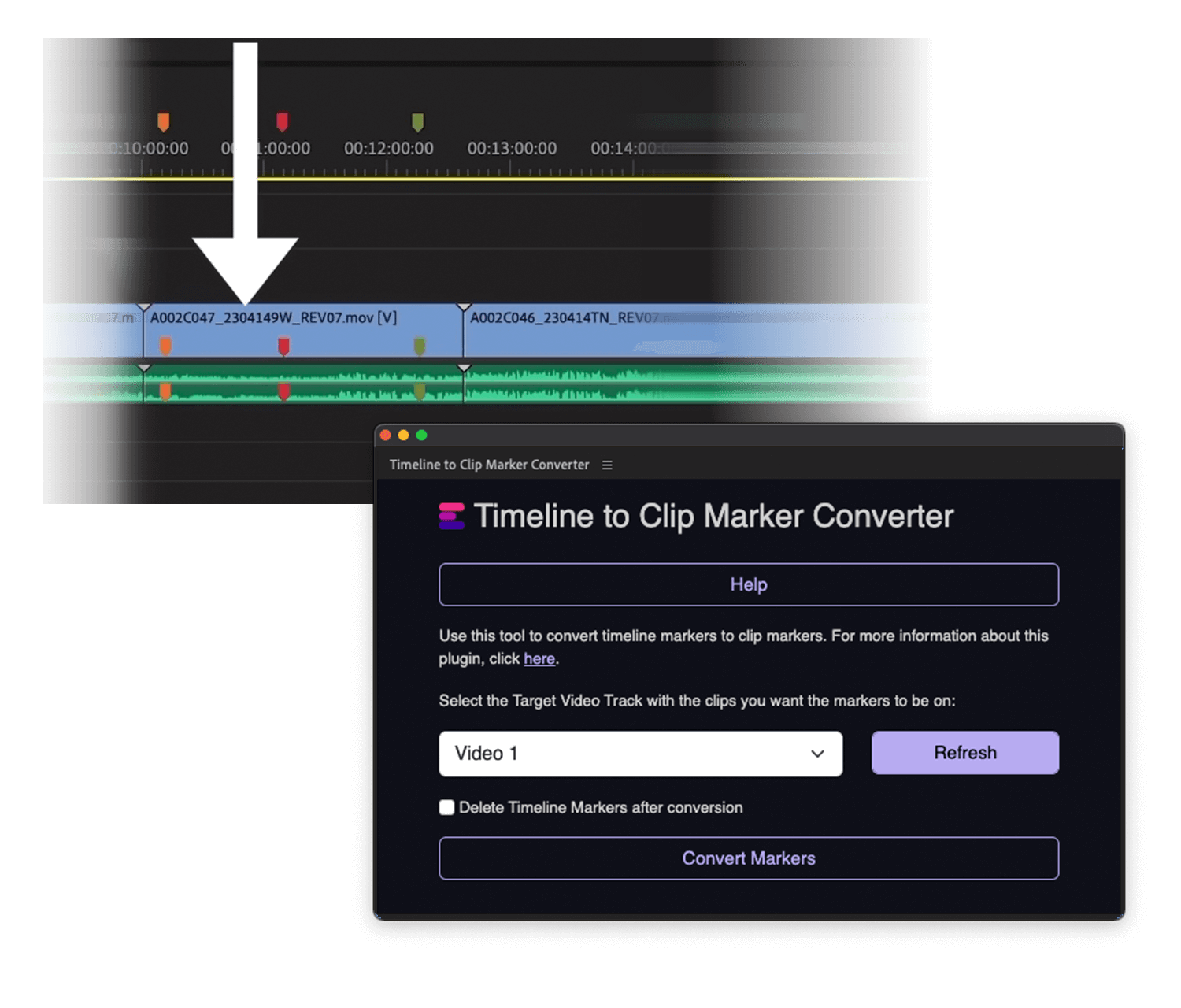 With this plugin you can easily convert all timeline markers to clip markers. You can also select the video layer where to place them and remove the timeline markers automatically after conversion. Use this plugin to place all timeline markers on video clips.