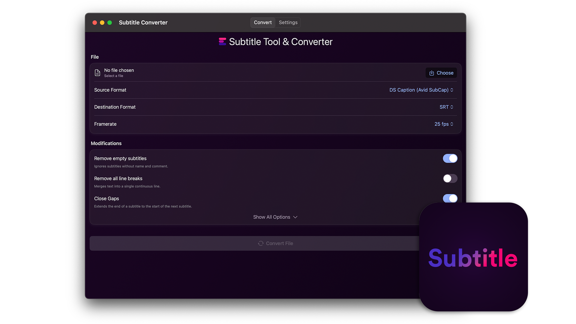 Convert subtitles to other file formats like SRT, VTT, SBV or use the tool to check subtitles for guidelines, repair, correct or move them. You can also convert subtitles to markers and use them in an editing program.